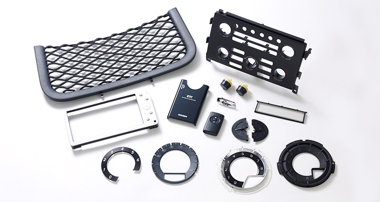 採用例:内装用部品(インパネ・メーターリング )・キーレスボタン・エンブレム・防水コネクター 等