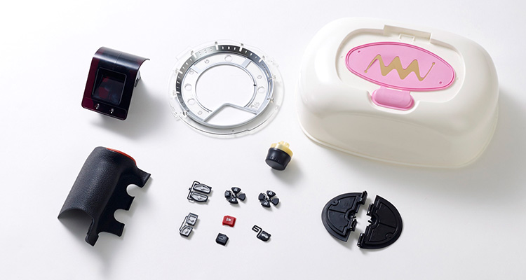 2色成形は、色の異なる2つの同種材料を成形する技術で、ファッション性に富んだ製品を生み出します。塗装やホットスタンプなどとは違い、耐久性のある加飾、高級感のある仕上がりが可能です。