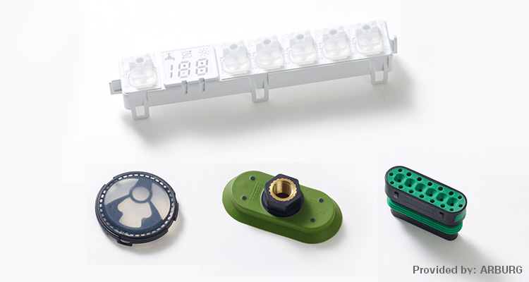 This technology enables product development in a wide range of fields that could not be handled conventionally, by bonding of silicone rubber and thermoplastic resin, which have better physical properties by comparison to elastomers (i.e. permanent compression strain, heat resistance, and electrical insulation).